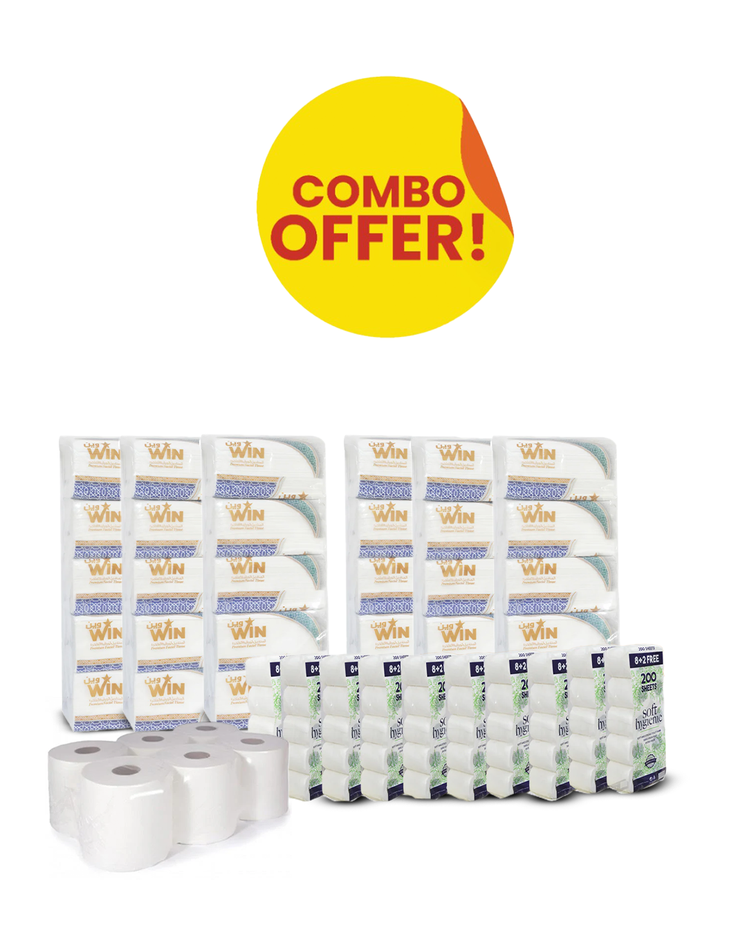 WIN SOFT FACIAL TISSUE NYLON PACK 600 SHEETS PACK OF 30+ Maxi Roll 700G Pack of 6 + SNH Toilet Roll 200 Sheets Pack of 100 Rolls Combo