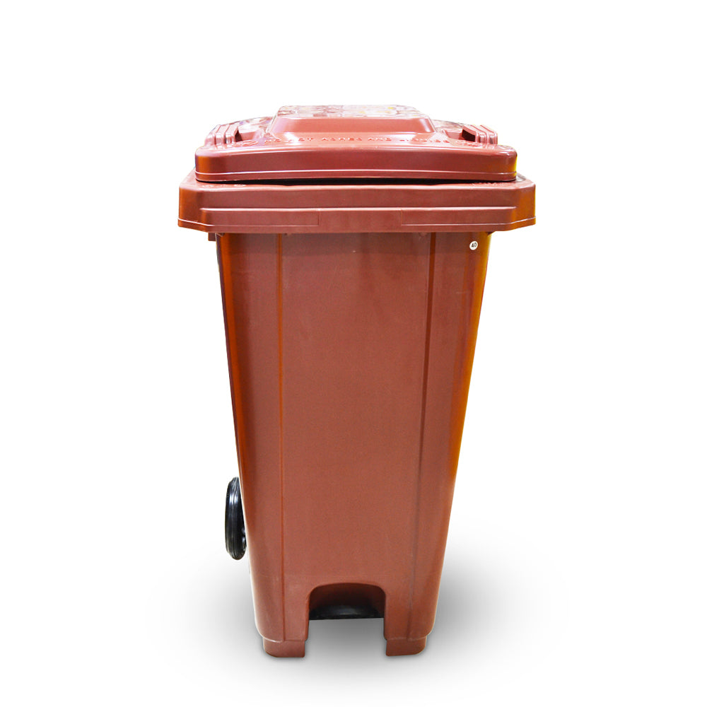 سلة مهملات بلاستيكية سعة 120 لترًا مزودة بدواسة وعجلات، لون بني