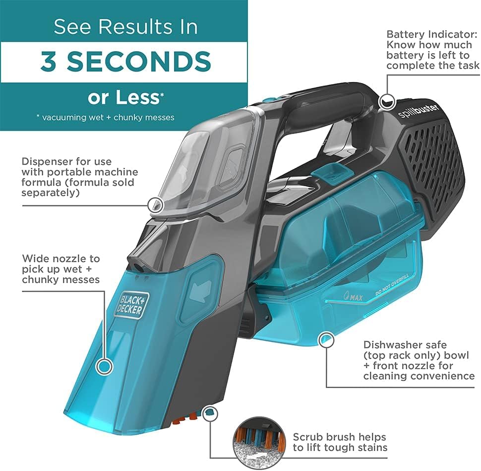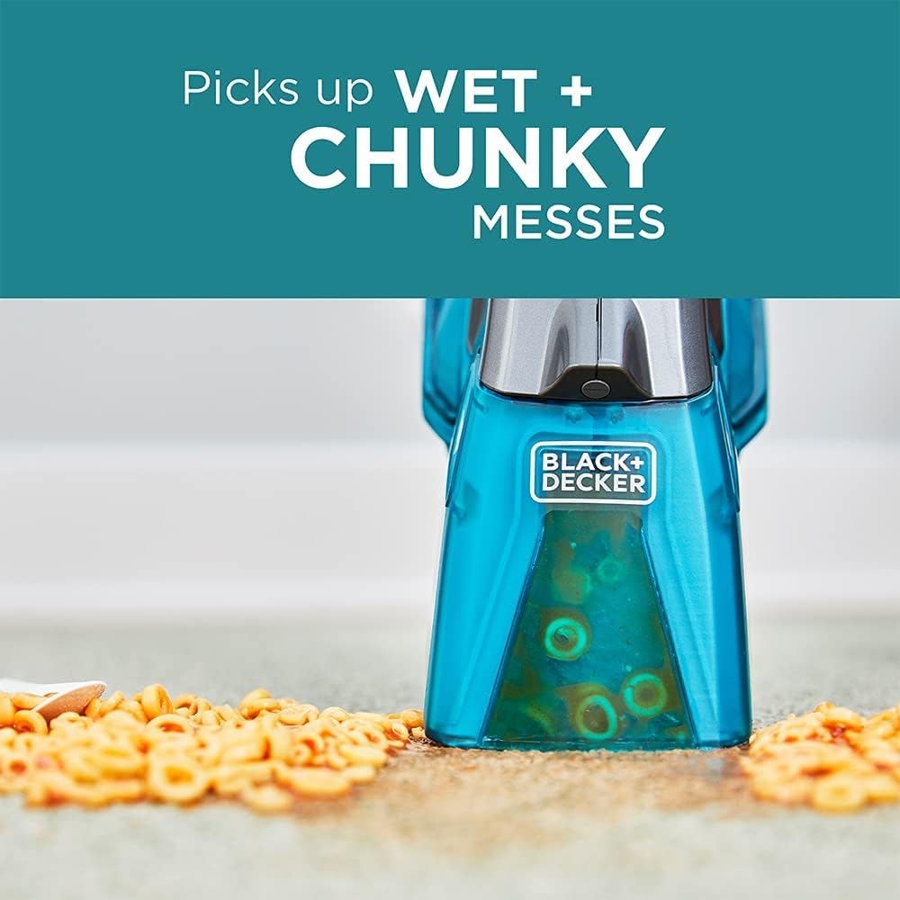مكنسة بلاك آند ديكر اللاسلكية المحمولة لتنظيف السجاد والانسكابات السائلة، مزودة بفرشاة دوارة لإزالة الأوساخ الصلبة والسائلة، 12 فولت، قوة شفط 20 واط هوائي