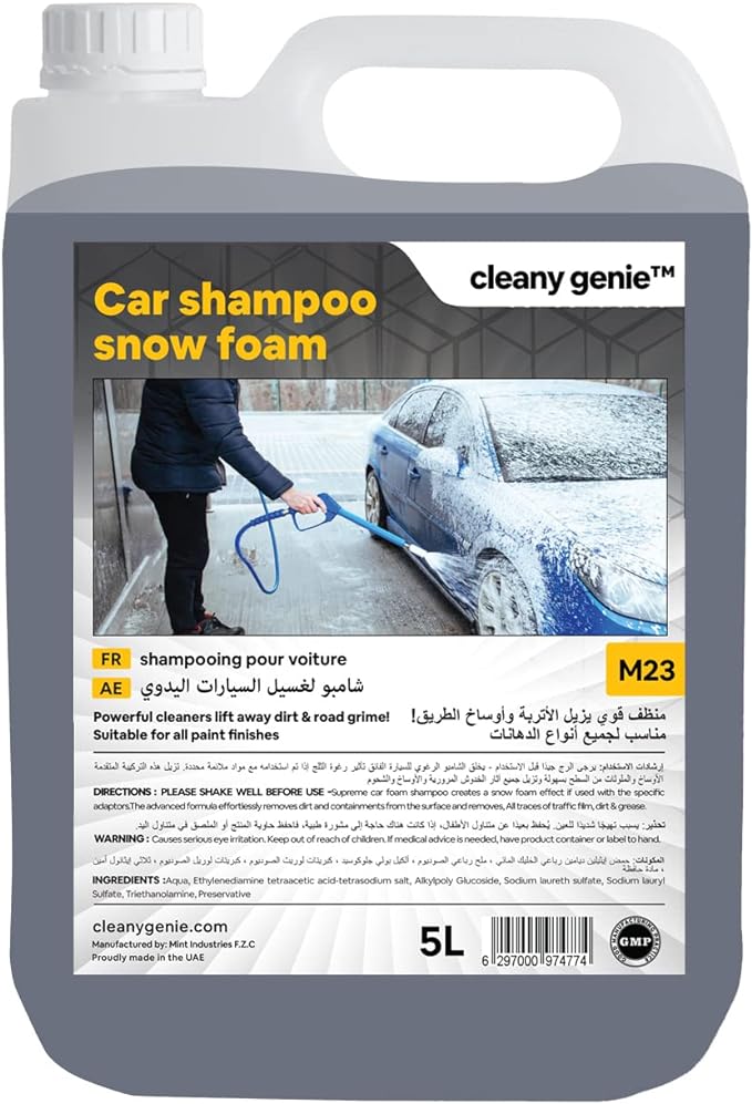 - Cleany Genie Car Snow Foam مخصص لعشاق السيارات الجادين الذين استثمروا في غسالة الضغط ومدفع الرغوة لغسيل السيارات في المنزل. يوفر أقصى قدر من الرغوة لإزالة جميع أنواع أغشية الطريق والأوساخ والطين.