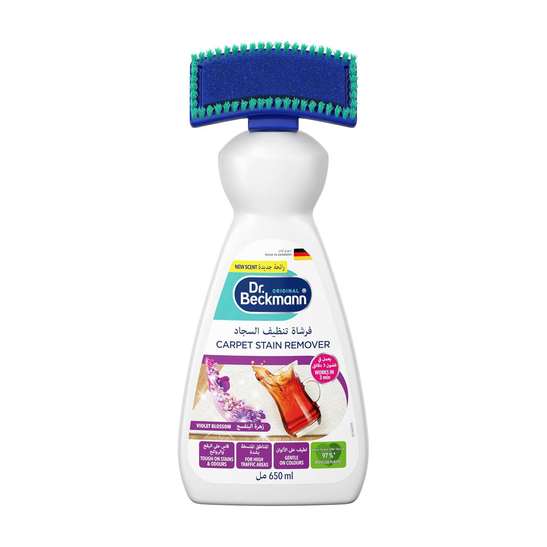 مزيل بقع السجاد من دكتور بيكمان مع فرشاة 2 في 1 - تركيبة أوكسي باور للبقع الصعبة، النبيذ الأحمر، القهوة، العصير، الشحوم، الطين وروائح الحيوانات الأليفة - منظف سجاد سريع المفعول برائحة زهر البنفسج (650 مل)