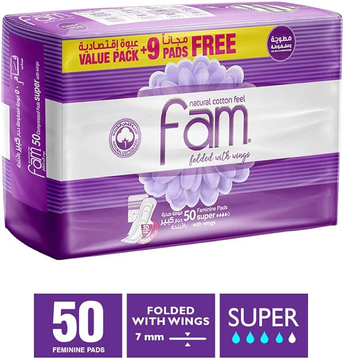 فام، ملمس القطن الطبيعي، ماكسي سميكة، مطوية بالأجنحة، فوط صحية فائقة، 50 فوطة