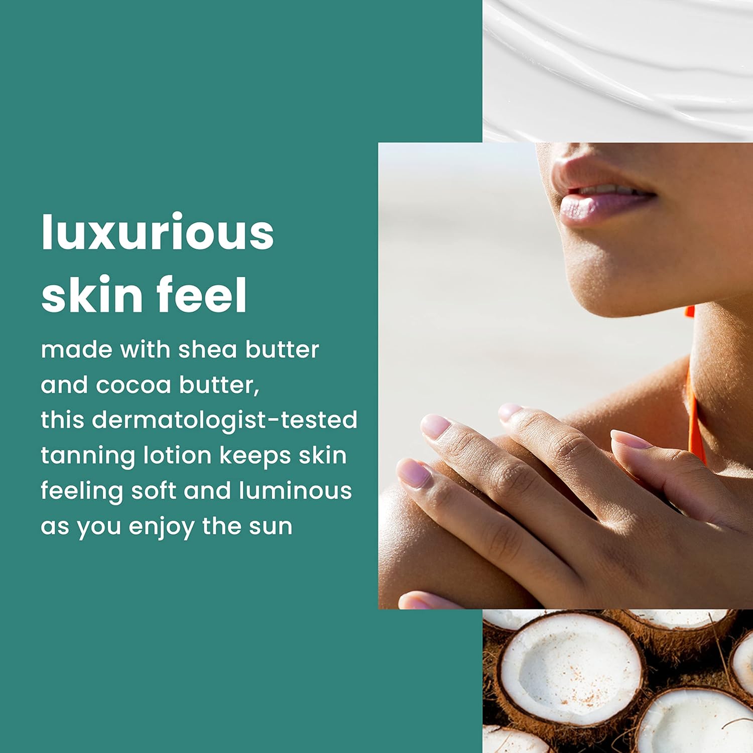 - Made with shea butter and cocoa butter, this lotion keeps skin soft and luminous as you enjoy the sun.