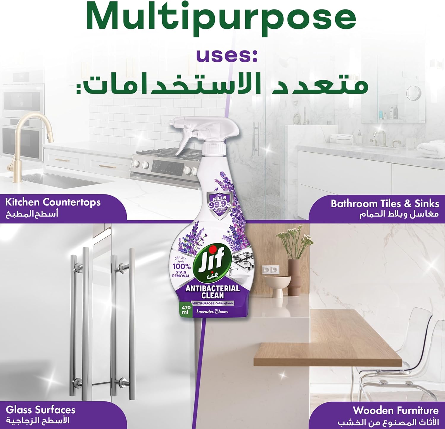 JIF Antibacterial Clean Multipurpose Spray, Lavender Bloom, 100% Stain Removal, Kills 99.9% of Germs, 470ml